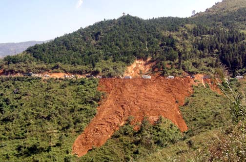 Landslide blocks the road- all the dirt in the photo